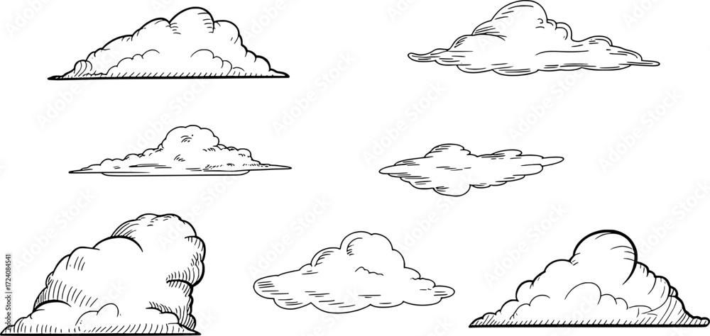 Fototapeta Fluffy cumulus clouds sketched on white weather atmospheric