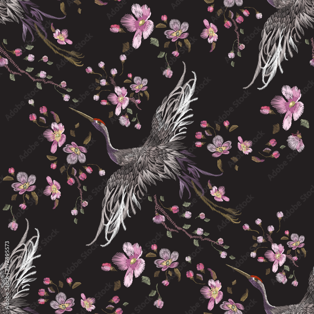 Fototapeta Embroidery oriental seamless pattern with cranes and cherry blossom