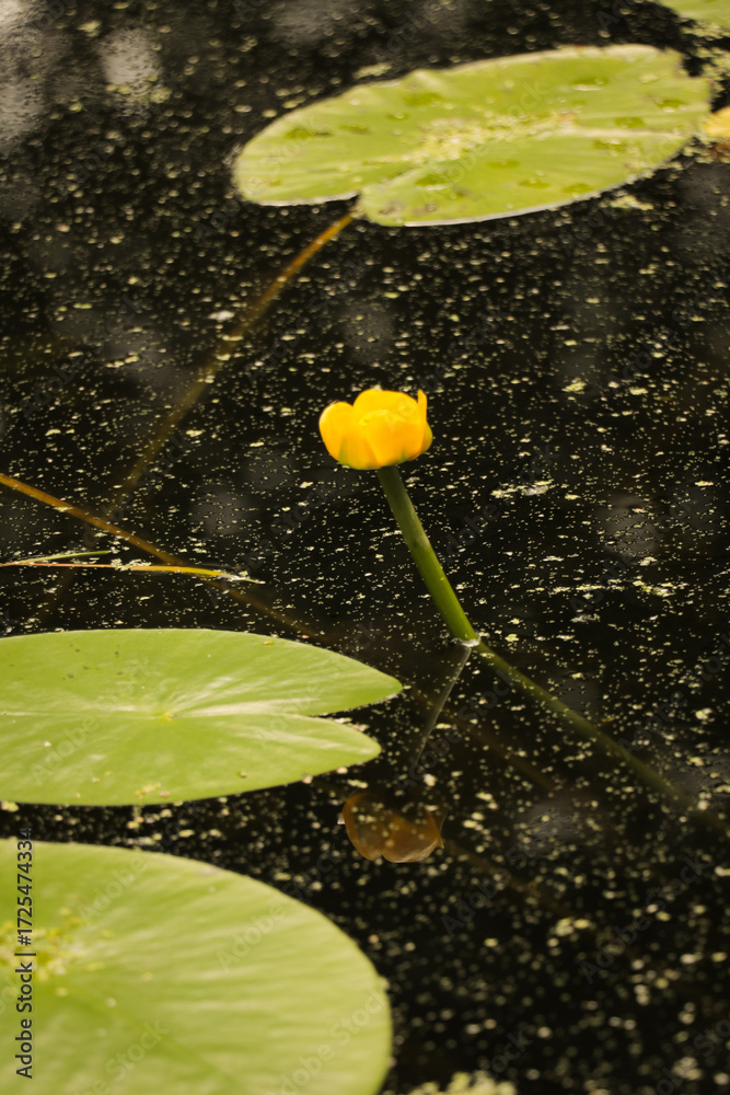 Fototapeta Close-up of a closed water lily bud floating on the surface of a calm pond surrounded by green lily pads in pond in local park
