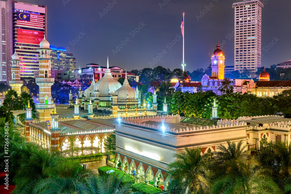 Fototapeta Kuala Lumpur nightscape with Jamek mosque and skyscrapers, Malaysia