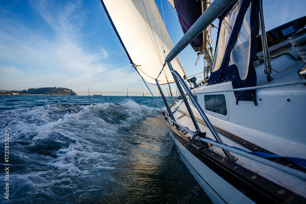 Fototapeta Sailboat sailing on the water with a bridge in background
