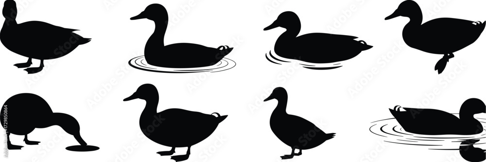 Fototapeta Black duck silhouettes in various poses, swimming, standing, feeding, perfect fo