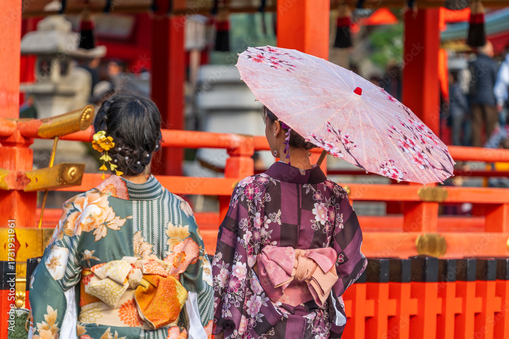 Fototapeta Japanese women wearing traditional kimono clothes and holding umbrella at shrine in Kyoto