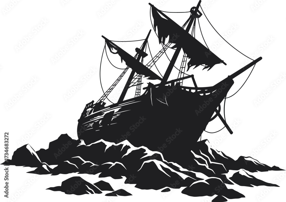 Fototapeta Silhouette of a beached shipwreck amidst jagged rocks detailed nautical art flat