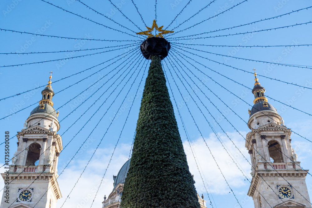 Fototapeta Christmas Tree and Basilica Towers in Budapest