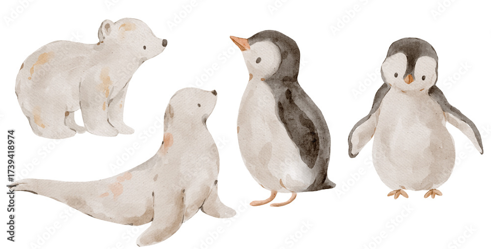 Fototapeta Watercolor Polar Animals, Cute Arctic Bear Seal and Penguin Chicks for Winter Ch