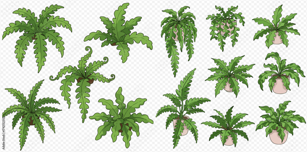 Fototapeta A collection of fern illustrations, some in pots, others hanging, all with detailed green fronds