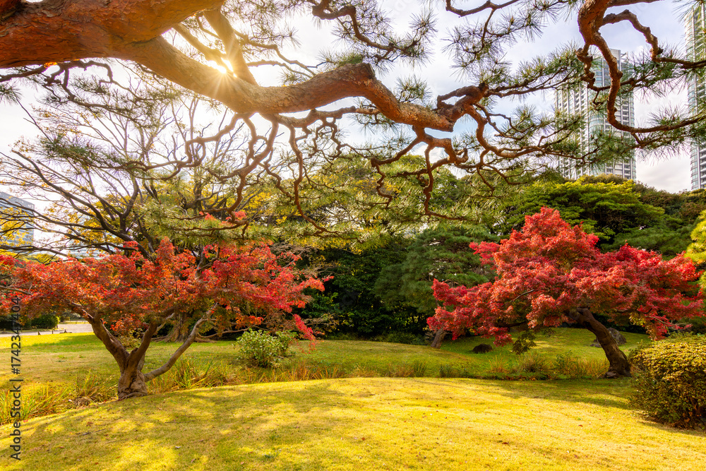 Fototapeta Red maple trees in Hamarikyu gardens in autumn, Tokyo, Japan