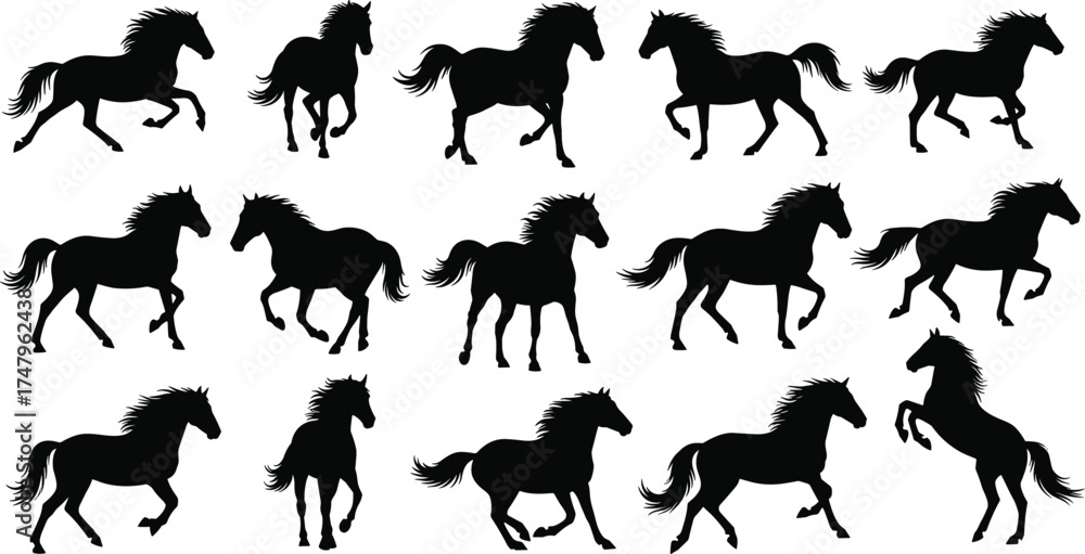 Fototapeta Horse silhouette collection, galloping horse poses, rearing horse vector, trotti