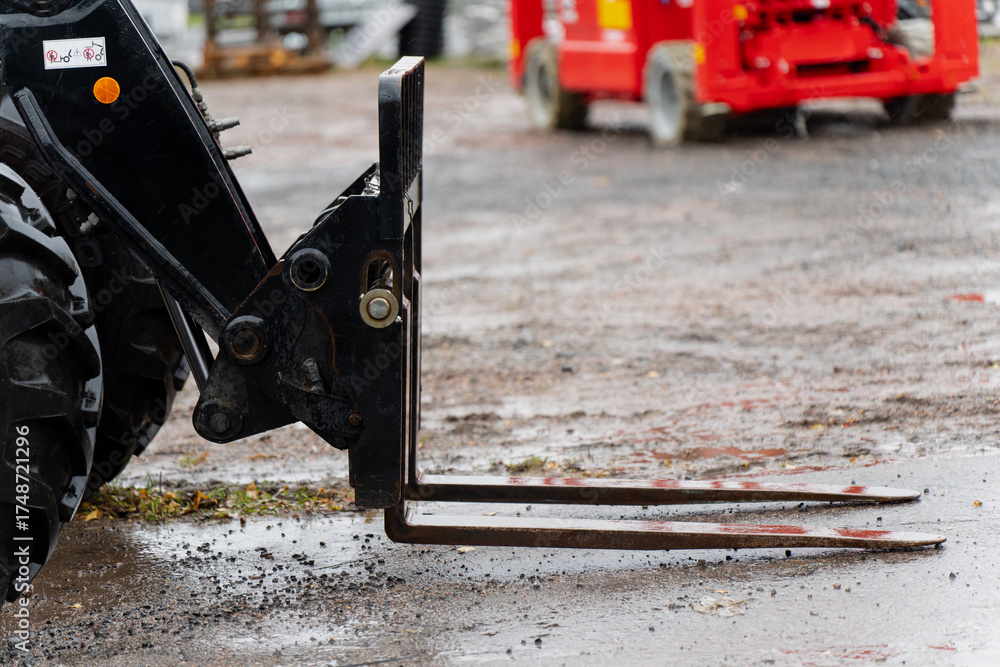 Fototapeta Close view of forklift attachment mounted on front loader tractor with metal pal