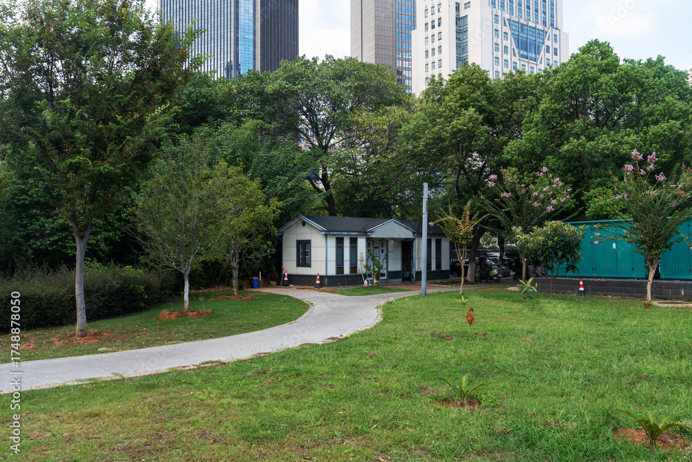 Fototapeta city park with modern building background in shanghai
