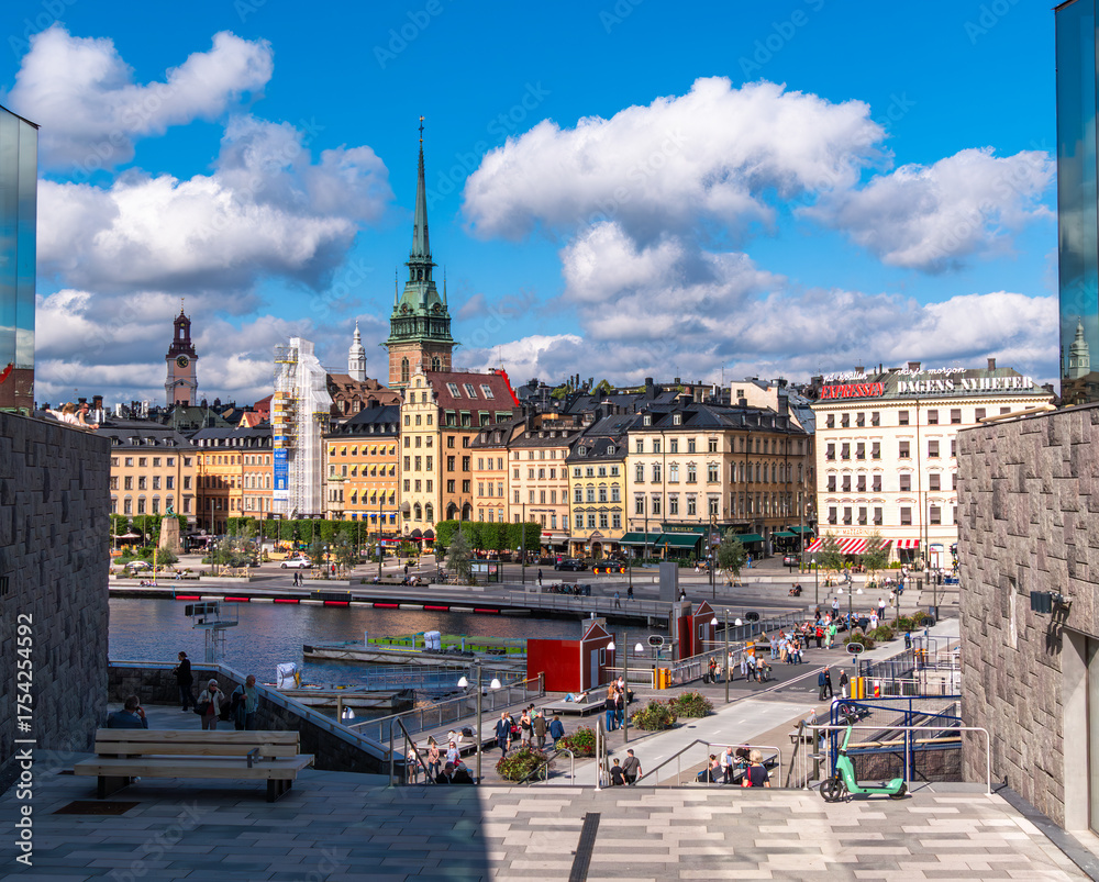 Fototapeta Stockholm's Gamla Stan with Church Spire and Colorful Buildings