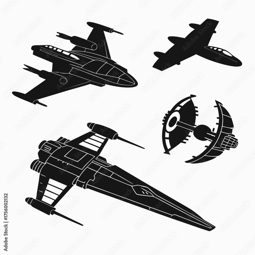 Fototapeta Collection of black silhouettes of futuristic spaceships and aircraft on a white