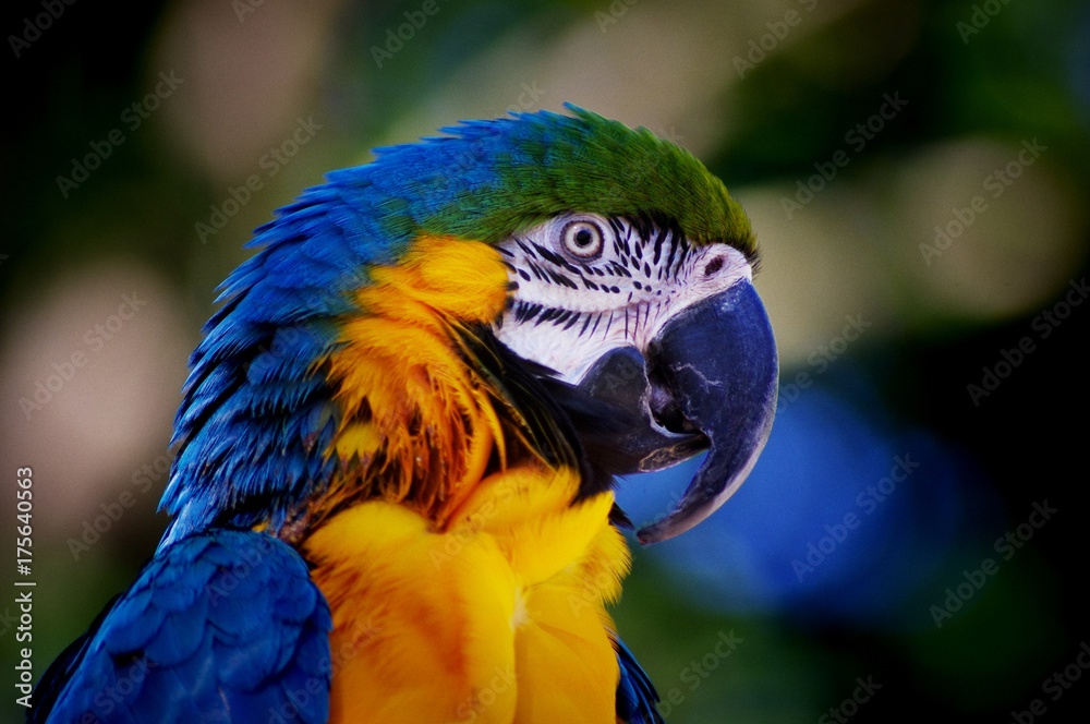 Fototapeta Blue green and yellow parrot face closeup