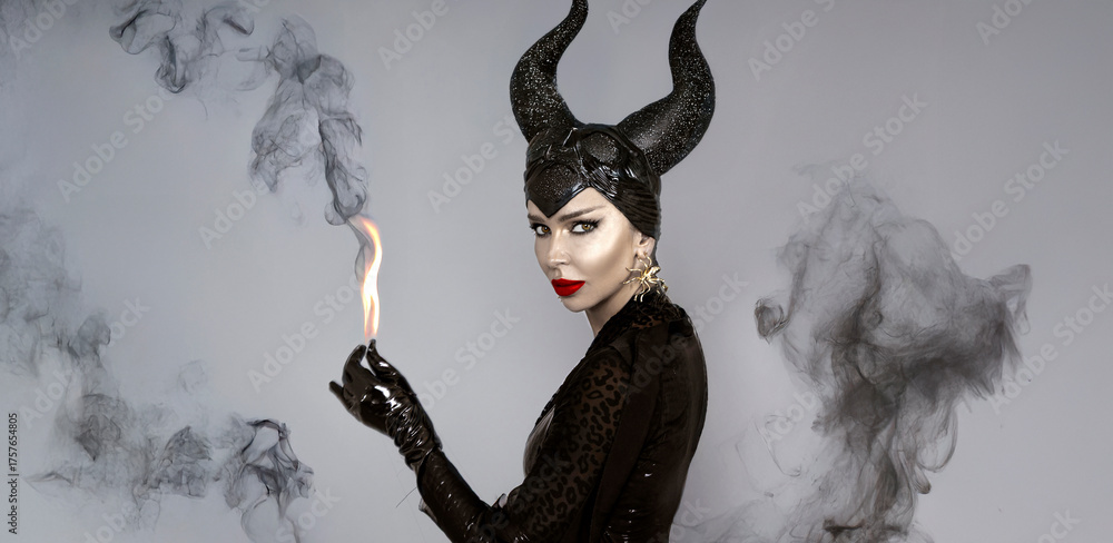 Fototapeta Dark queen with black horns and red lips in dramatic Halloween portrait Witch wi
