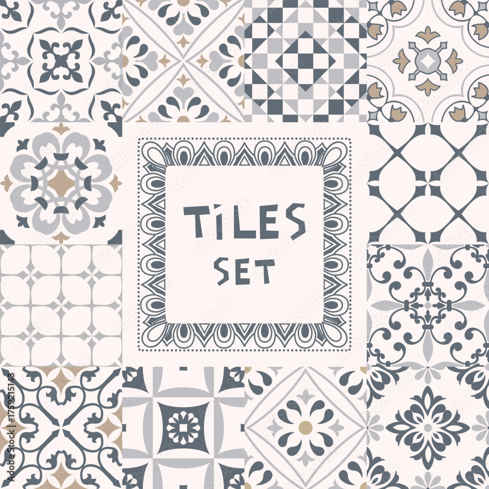 Fototapeta Set of tiles Azulejos in gray