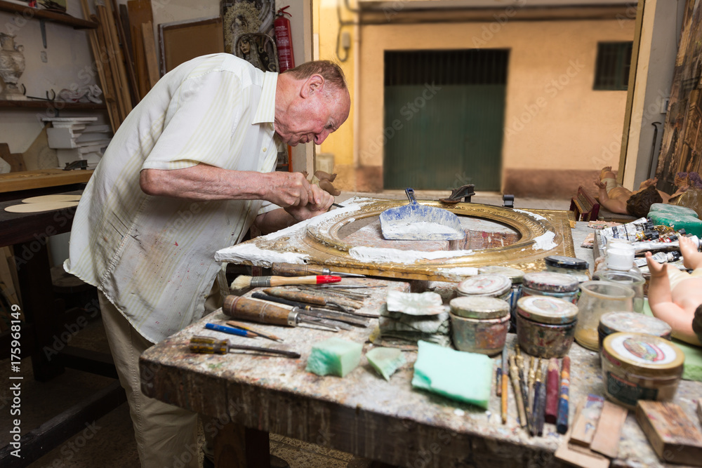Fototapeta Maestro restaurador en su taller trabajando el yeso con gubia.