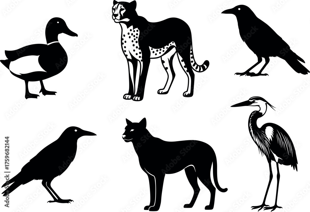 Fototapeta Silhouette set of wild animals and birds including duck, cheetah, crow, panther,