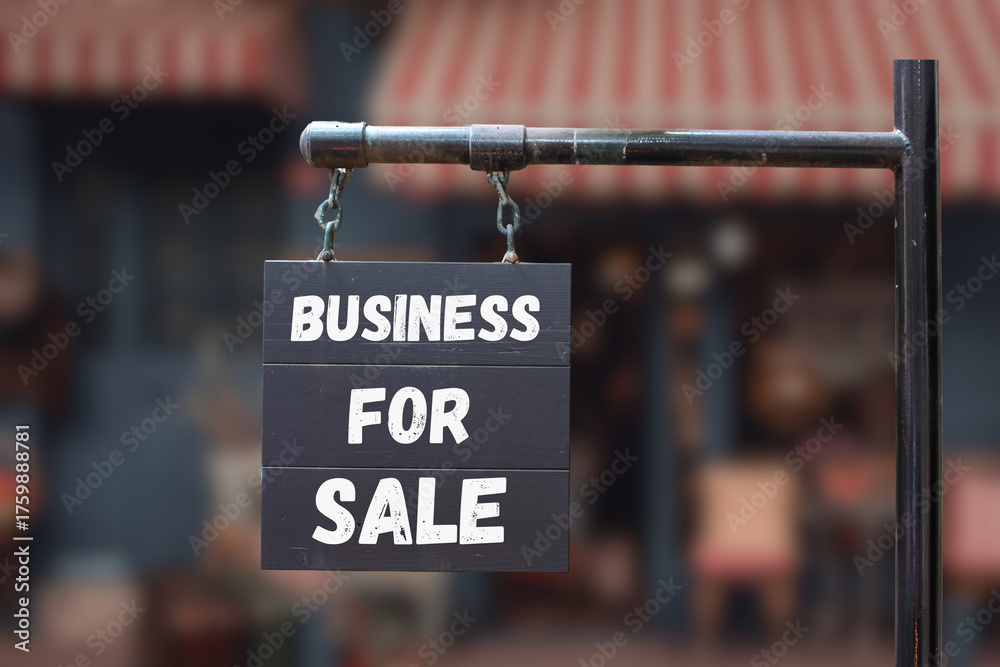 Fototapeta Business For Sale sign hanging outside a blurry storefront