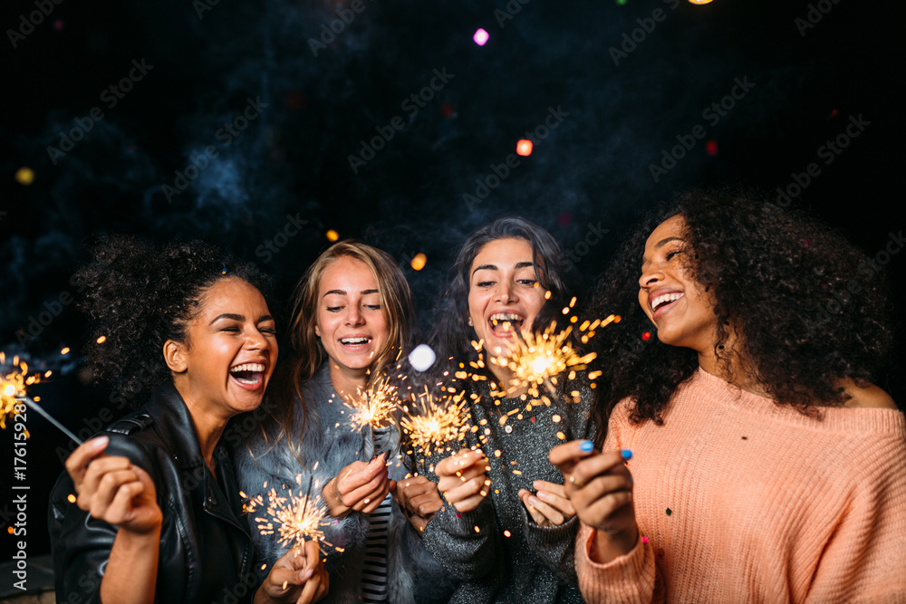 Fototapeta Outdoor shot of laughing friends with sparklers, standing together at night