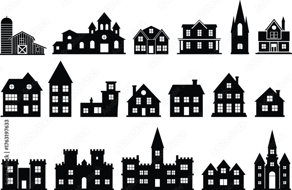 Fototapeta Architectural silhouette set, rural barns, residential homes, churches and castl