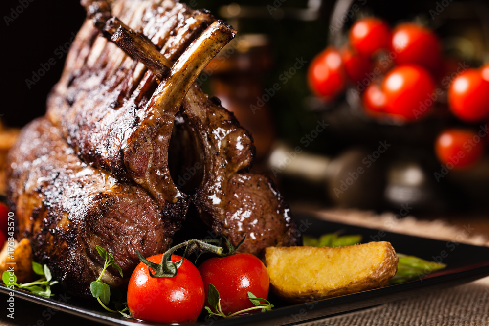 Fototapeta Baked lamb loin, served with asparagus.
