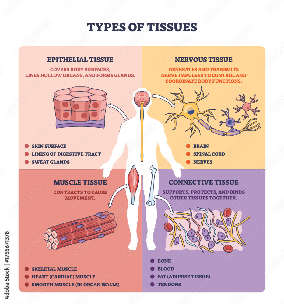 Fototapeta Types of tissues overview, brief diagram shows epithelial, muscle, connective, and nervous tissue around a human silhouette, key objects, neuron, muscle fiber, epithelial cells