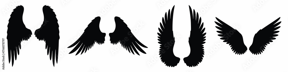Fototapeta Collection of four distinct black silhouette angel wings designs isolated on a w