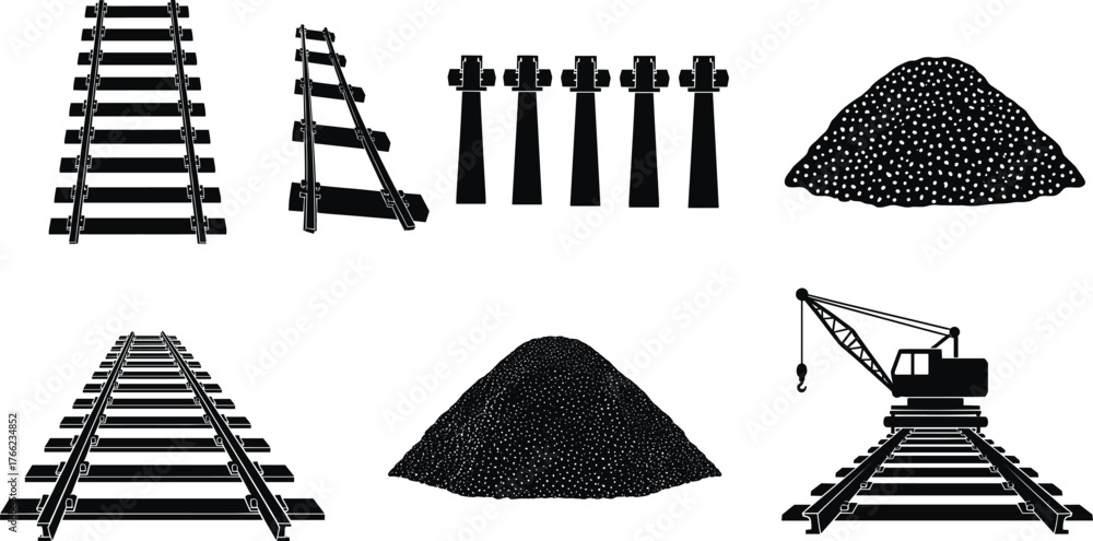 Fototapeta Railway construction icons, track elements, ballast pile, rail fasteners, crane
