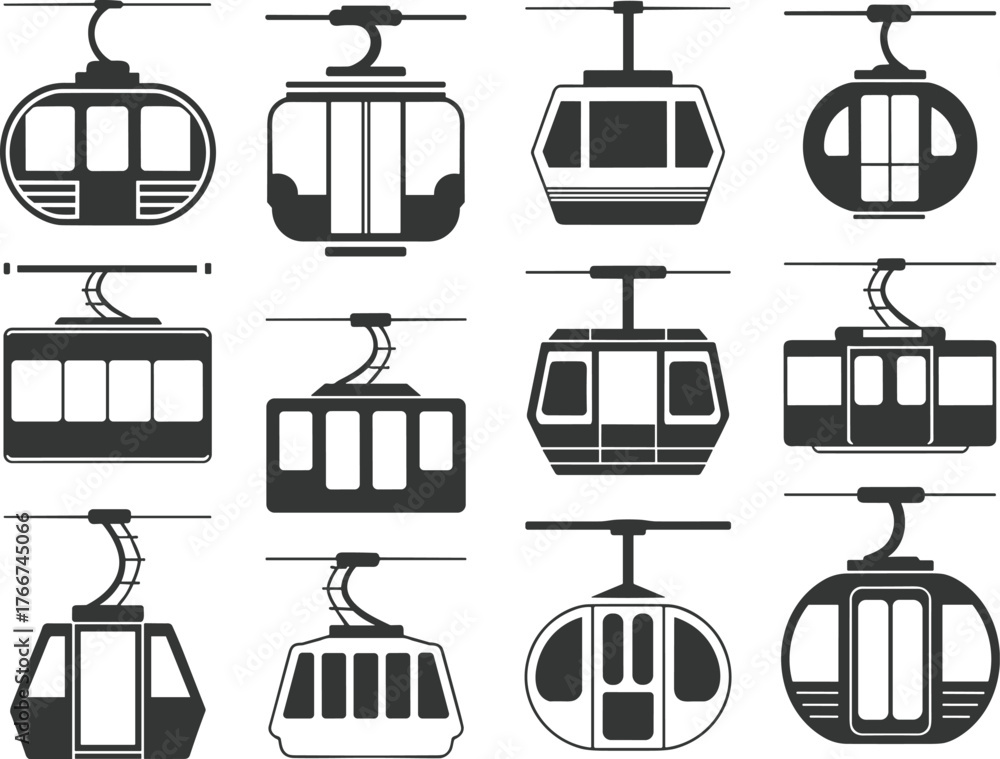 Fototapeta Cable car icons set, gondola vector silhouettes, aerial transport cabins, ski li