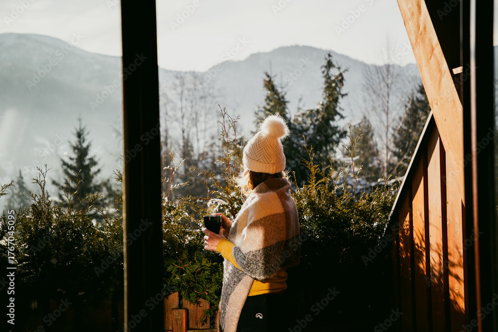 Fototapeta woman enjoying hot cup of tea on terrace in winter mountains ski holiday lodging