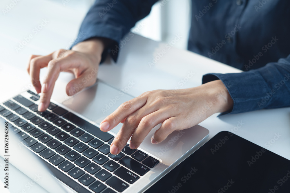 Fototapeta Close up, business woman hand typing, working on laptop computer with digital ta
