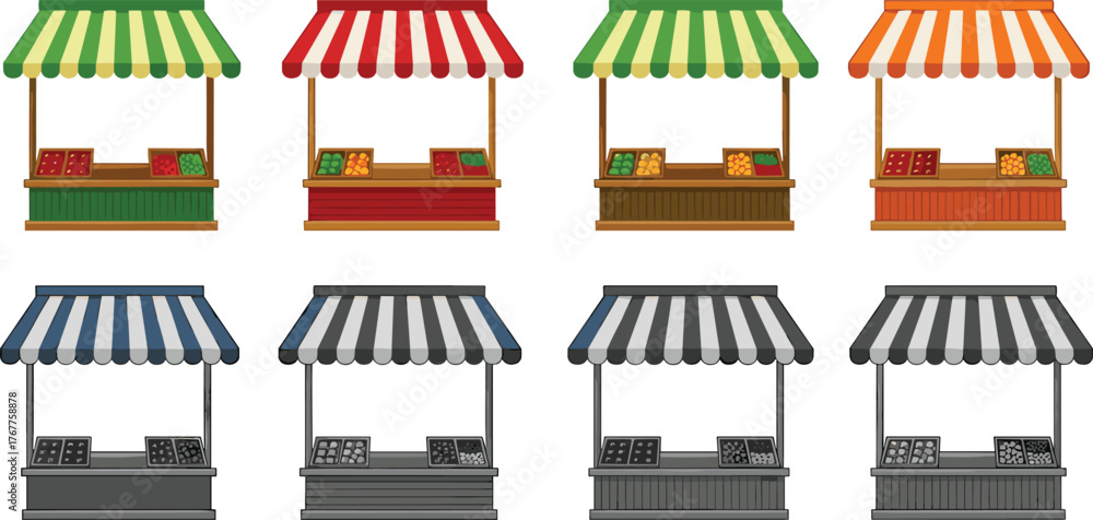 Fototapeta Colorful market stalls, grayscale fruit counters, vibrant canopy design, fresh p