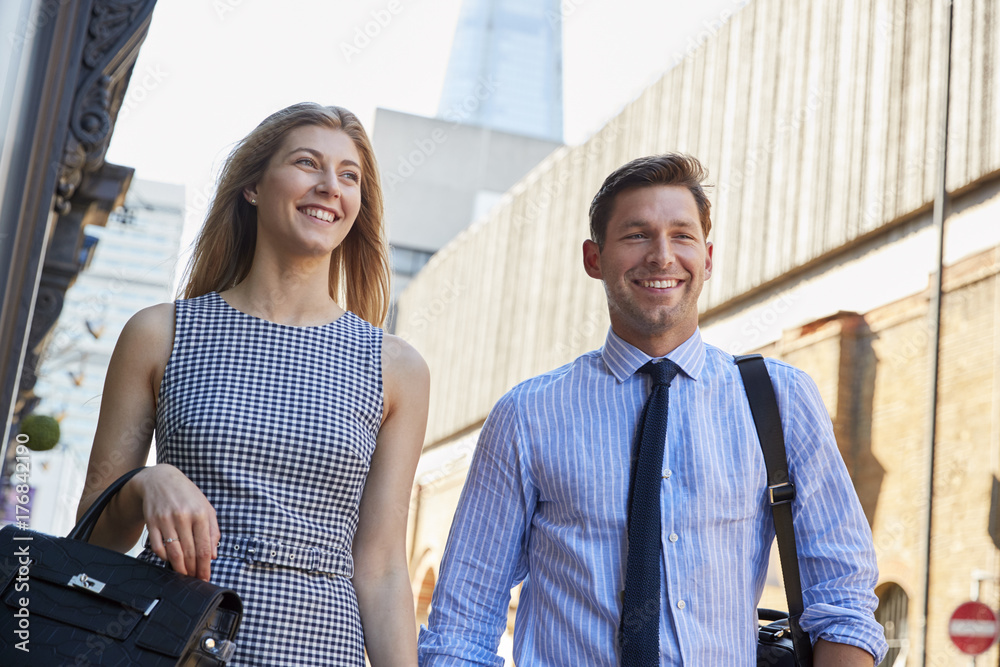 Fototapeta Businessman And Businesswoman Walk to Work Through City Street