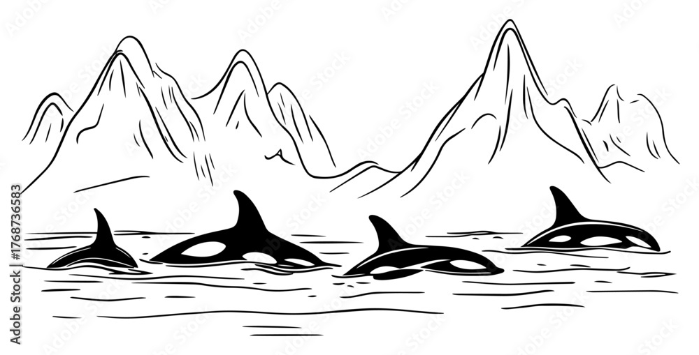 Fototapeta Orcas swimming near snowy mountains – hand-drawn Arctic wildlife seascape vector