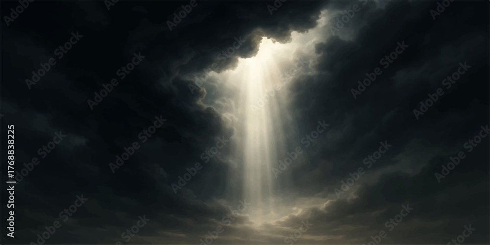 Fototapeta Dramatic dark storm clouds part to reveal bright sun rays in the blue sky
