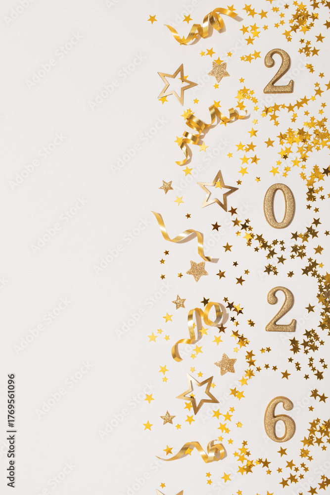 Fototapeta 2026 Happy New Year golden glittering numbers top view, flat lay.