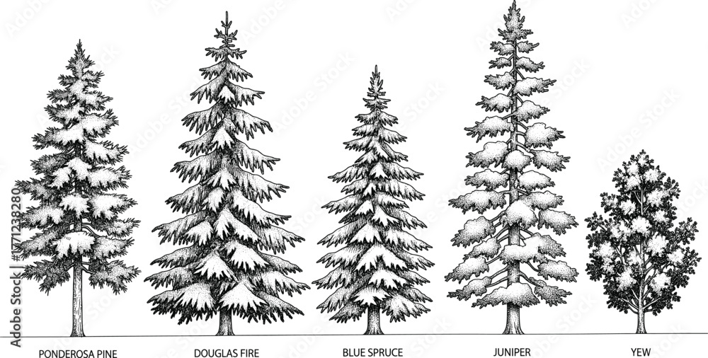 Fototapeta Black and white illustration of five coniferous trees—Ponderosa Pine, Douglas Fi
