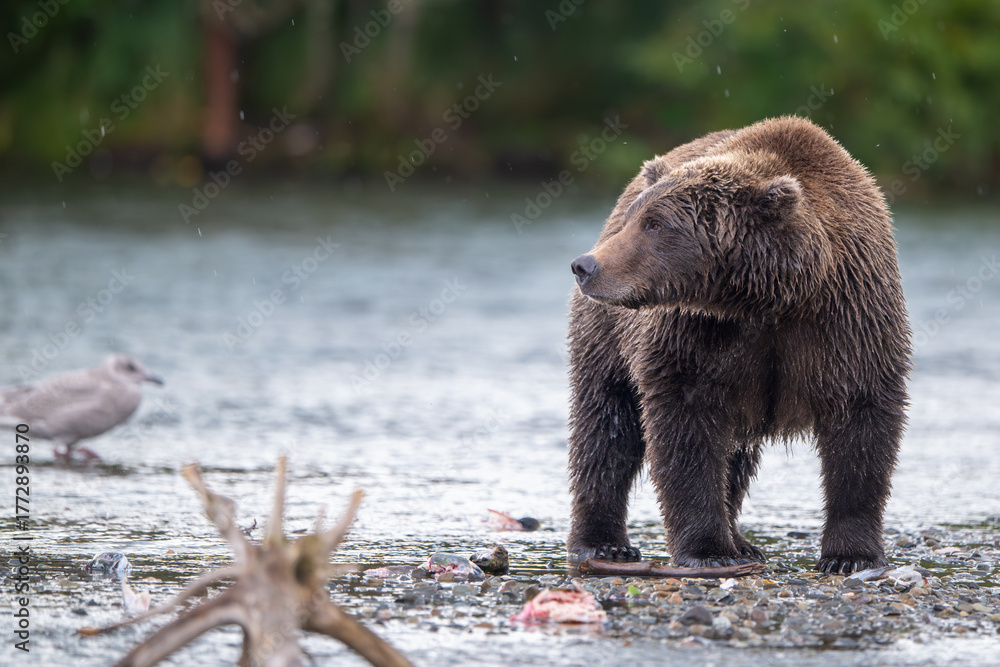 Fototapeta Alaskan brown bear standing in the shallows of Brooks River on a rainy day