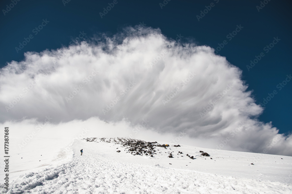 Fototapeta Stormy clouds overhang over the snow-capped mountain Elbrus