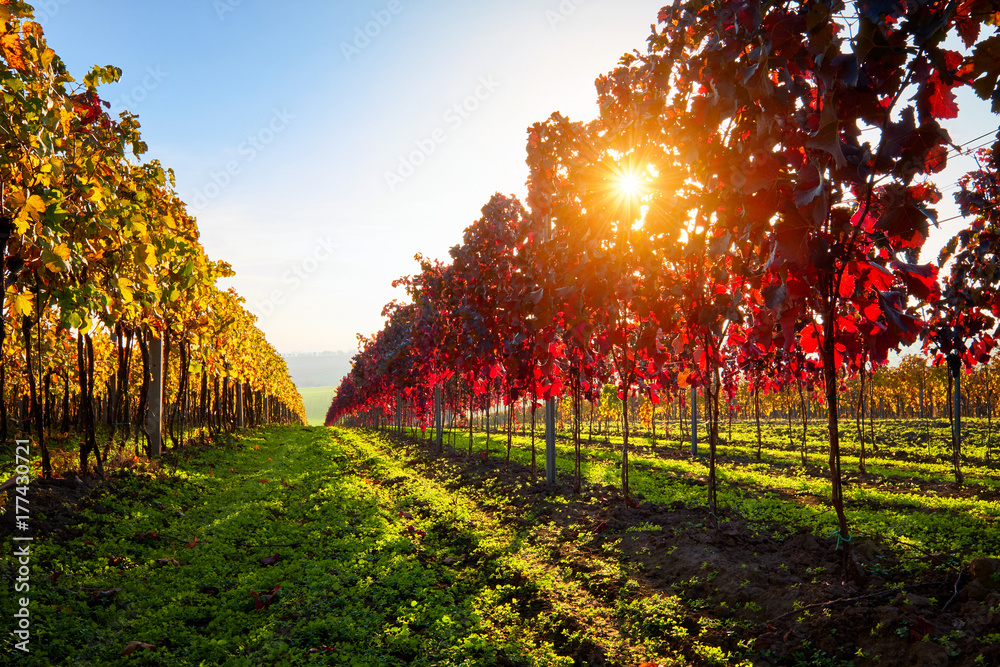 Fototapeta Autumn colorful vineyard with sunbeams at sunset