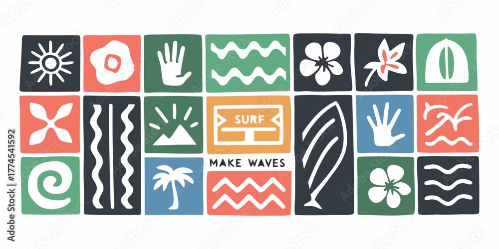 Fototapeta Collection of tropical and surf inspired icons and symbols in a grid pattern