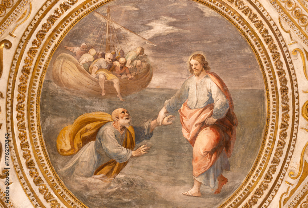 Fototapeta SALERNO, ITALY - OCTOBER 6, 2025: The ceiling fresco of Drowned Peter and Jesus in the crypt of Cathedral of St