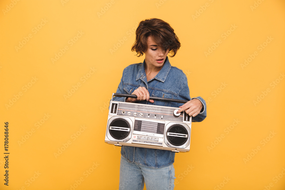 Fototapeta Portrait of a young happy girl dressed in denim jacket