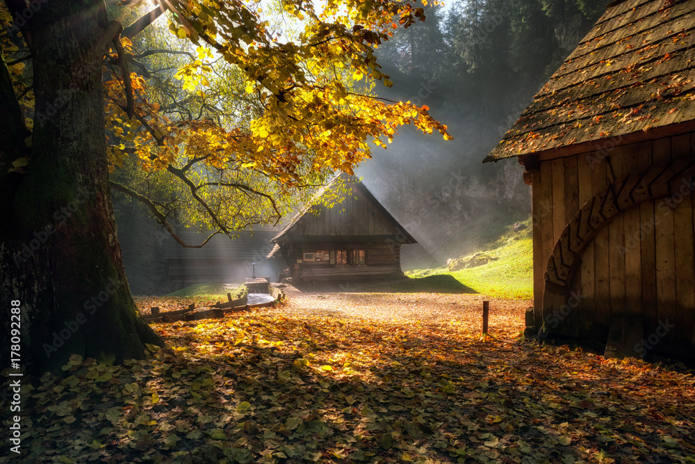 Fototapeta Traditional wooden cottages in autumn forest with sunlight and colorful leaves
