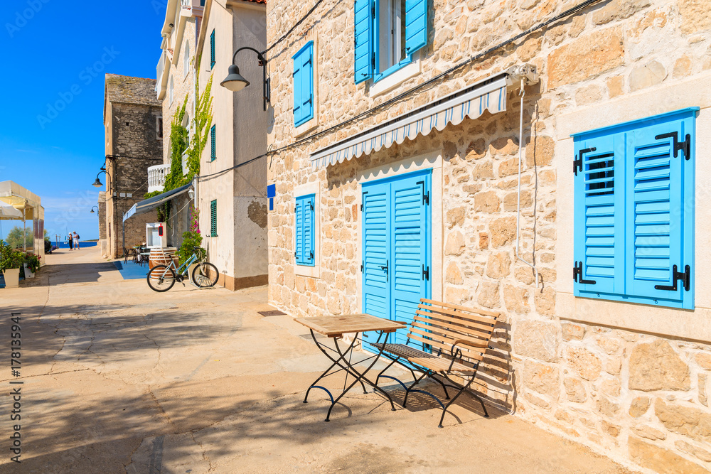 Fototapeta Street with traditional coastal restaurants in old town of Primosten, Dalmatia,