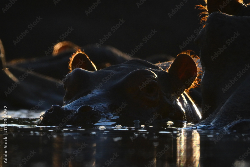 Fototapeta Close-up of backlit hippo calf in pond