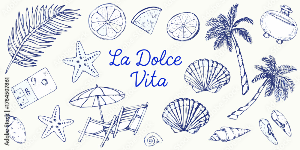 Fototapeta La dolce vita hand drawn sketch collection of beach and tropical vacation elemen