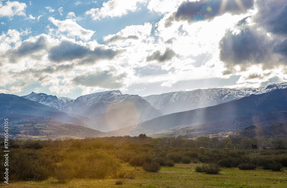 Fototapeta Cows grazing at sunset. Casas del Abad, Avila, Spain