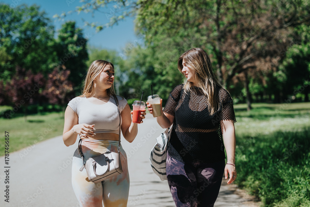 Fototapeta Two friends share a moment together, holding refreshing drinks, as they enjoy a stroll under a sunny sky surrounded by lush greenery